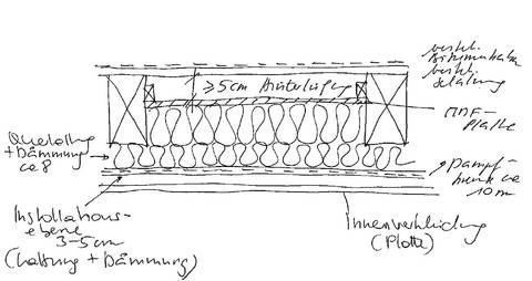 Ein weitere Möglichkeit der Sanierung wäre einen hinterlüfteten Luftraum zwischen Dämmung und der Dachschalung zu bilden (siehe Systemskizze im Anhang) - dieser wird in Abhängigkeit der Sparrenhöhe und einer Querlattung errichtet. Der angesprochene Luftraum kann durch MDF-Platten gebildet werden. Wichtig dabei ist, dass der Luftraum an der Traufe eine Zuluft und am First eine Abluft aufweist und das Dach ein Steildach ist.